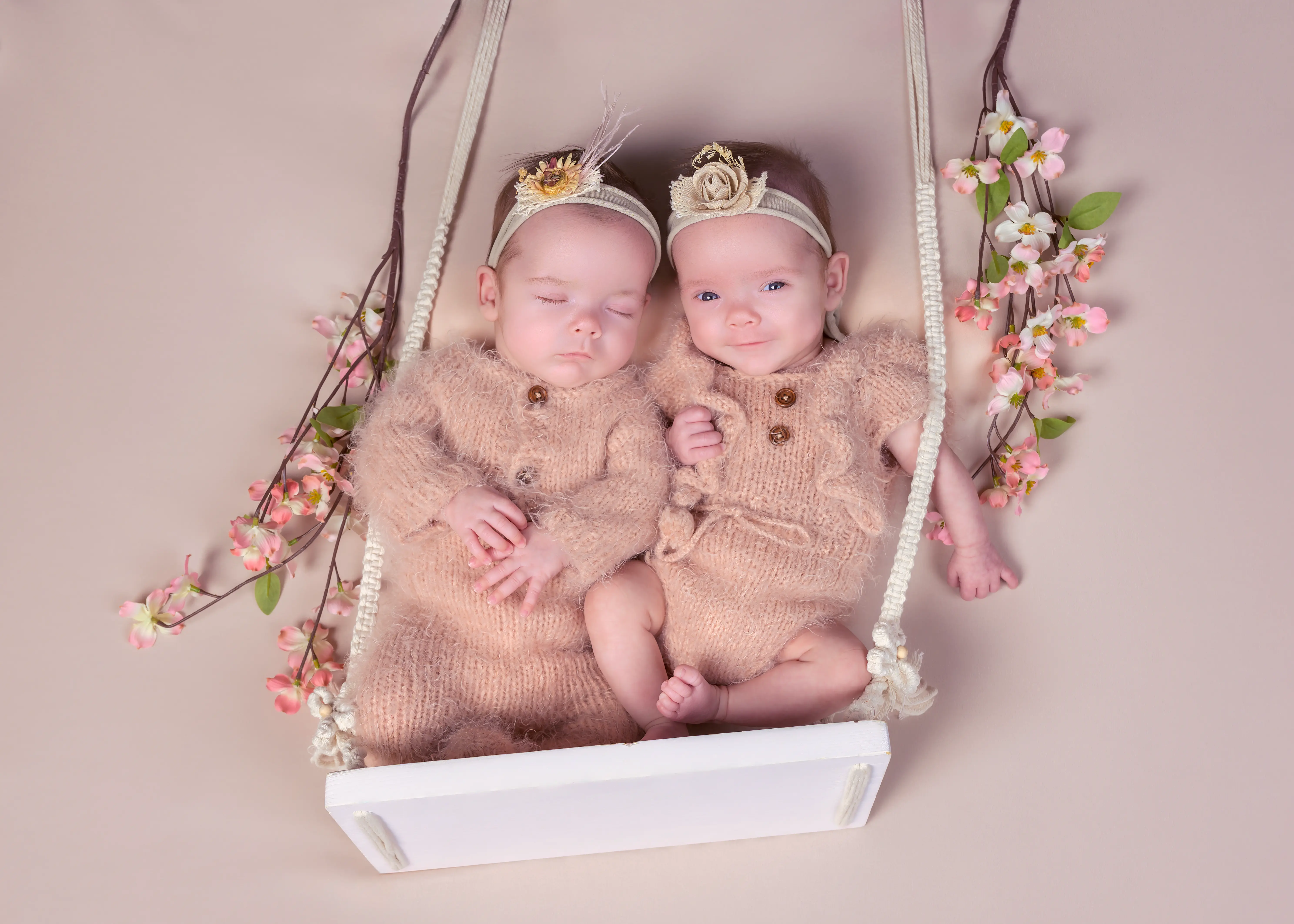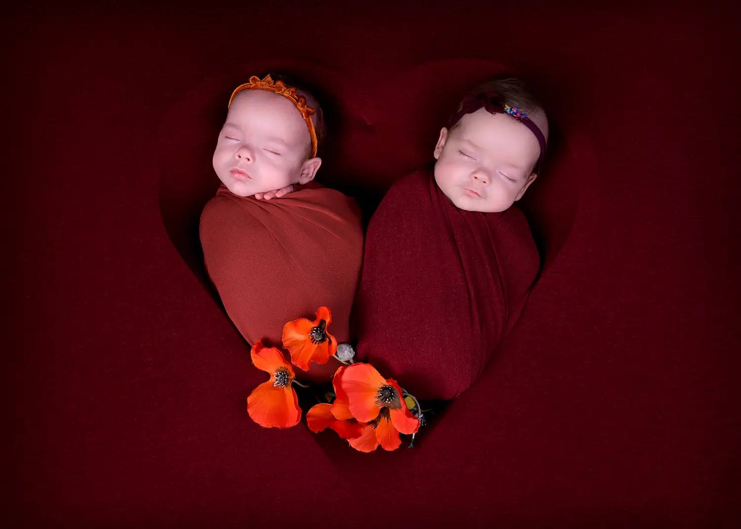 I think Rubi and Rose felt tired and went to sleep. They made the task easier for me. I changed them into burgundy and rust-colored swaddles. For a change, I got a carpet with a heart-shaped dent and made the two siblings lie in it. They wore matching headbands. To make the shot livelier, I added a few orchids. This is one of the best newborn shots I have ever taken.